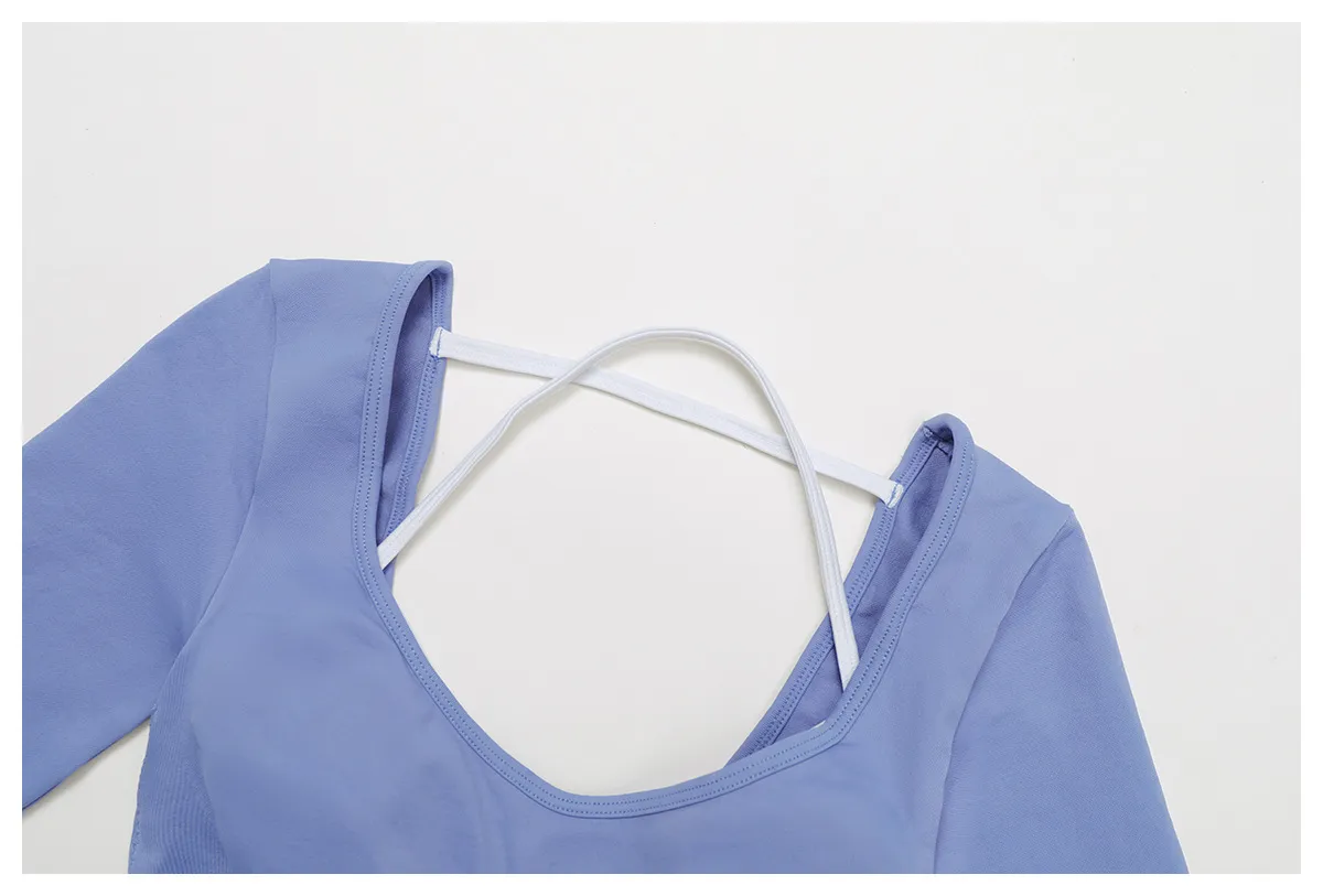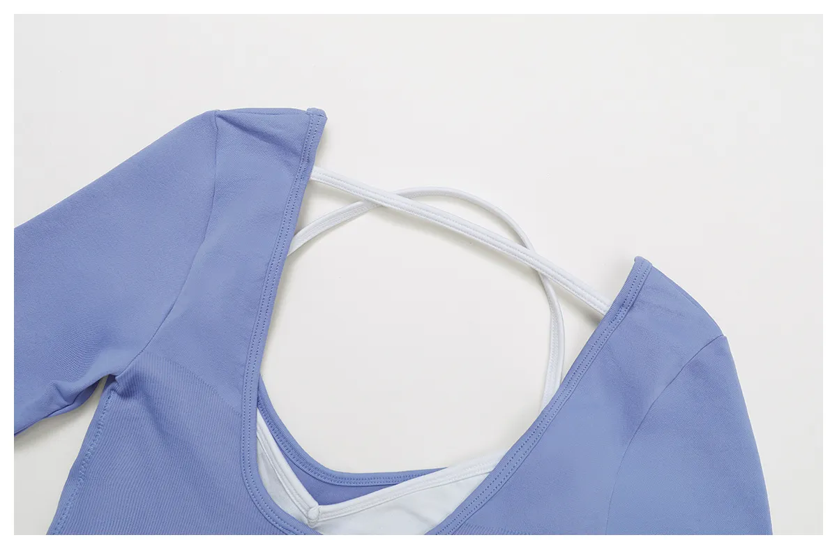 Upgrade your workout wardrobe with our Seamless Color-Block Yoga Long Sleeve Top, a stylish and functional addition to any seamless gym set. This crop top features a false layered design with contrast shoulder straps, creating a modern athletic look without the bulk. The U-back cutout enhances breathability and adds a fashion-forward touch, while the sleek long sleeves and cropped fit offer freedom of movement and a flattering silhouette.