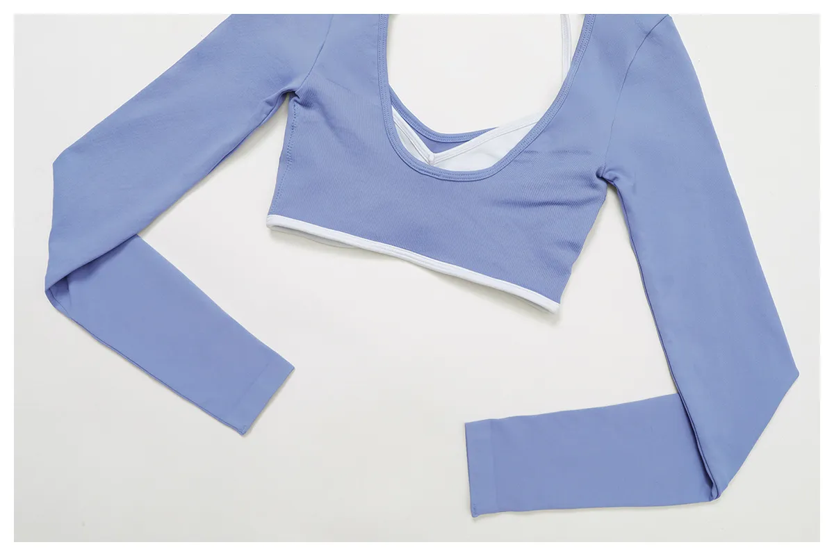 Seamless Color-Block Yoga Long Sleeve Top | False Layered Crop Top with U-Back Cutout